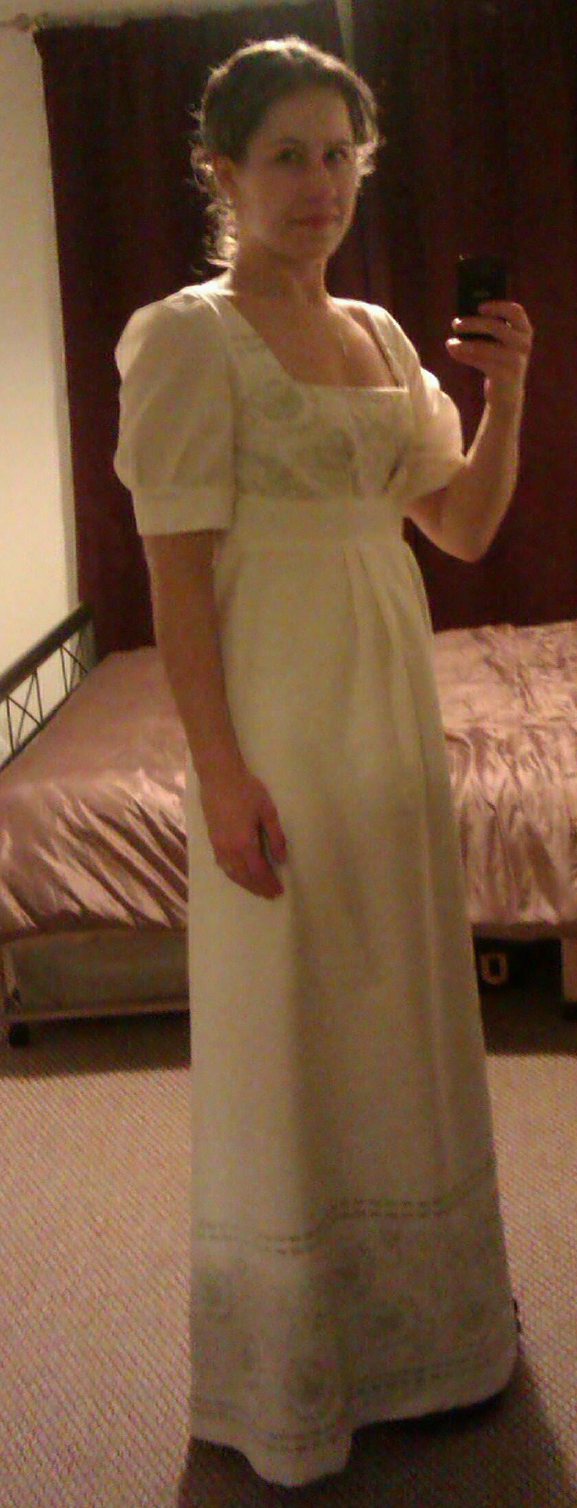 The ball was held for a friend’s 21st birthday, and it was wonderful, with period dancing (including the one that Elizabeth dances with Darcy in the BBC’s Pride and Prejudice, which bizarrely enough is called Mr Beveridge’s Maggot), period card games (although we gave up on quadrille and played Irish snap instead, except that we called out “quadrille” instead of “snap”) and people dressed up in Regency costumes. I wore a dress that I made for the occasion (see photo) and was so proud of the outcome. In short, it was a once-in-a-lifetime party and I had a fabulous time.