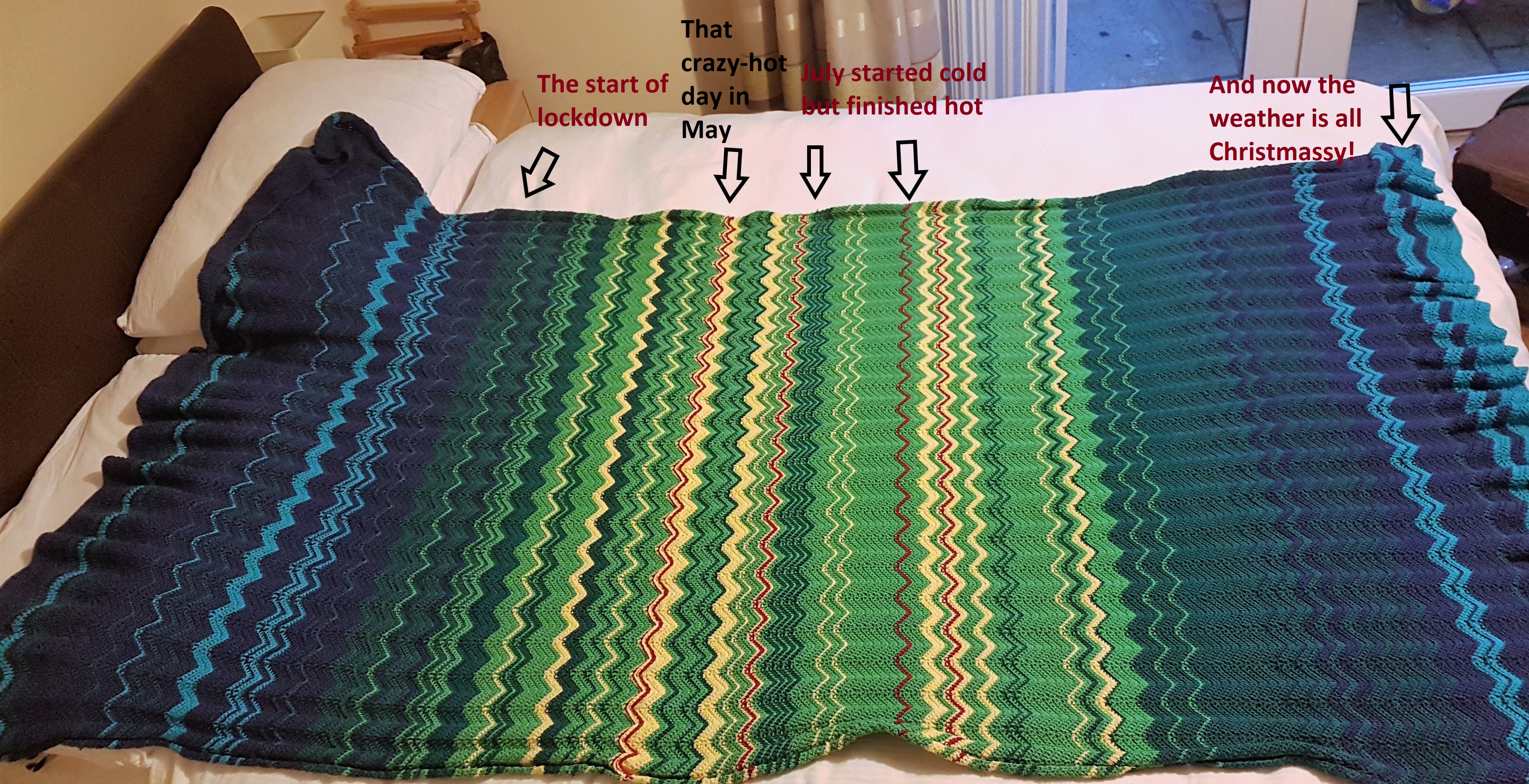 …the temperature blanket! Here it is, in all its multi-coloured glory! (Click on the photo for a larger image.)