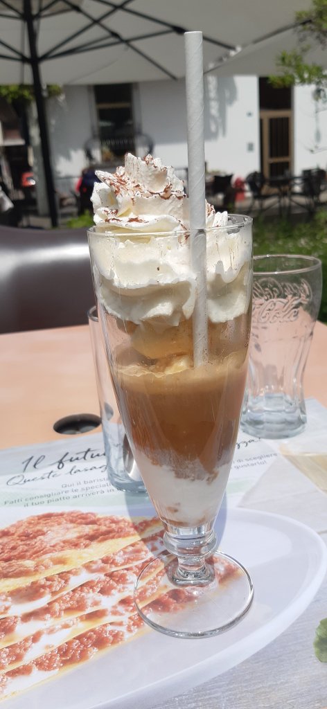 My passport was checked on the train within Switzerland, but we didn’t even stop at the Italian border and nobody wanted to see my covid pass or the passenger locator form I had diligently filled out earlier. I had allowed time for lunch in Tirano, rather than trying to catch the earlier train, so the lateness didn’t matter. I had the local speciality, black pasta with potatoes, which was lot nicer then it sounds, and an affogato for afterwards. It was not what I was expecting! (Affogato as it is served in Britain is a small dish of vanilla ice cream and a tiny jug of espresso.)