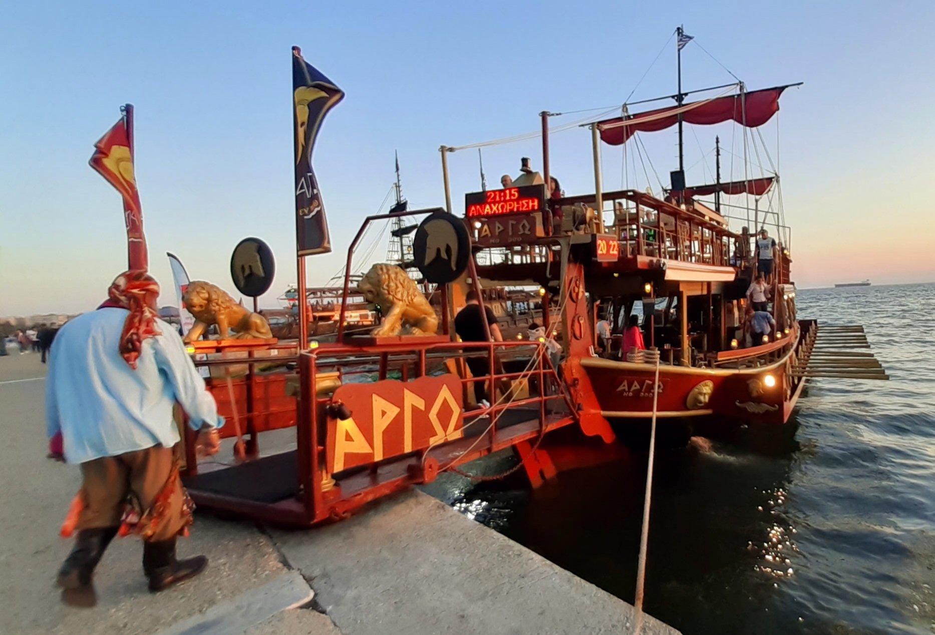 While I was sightseeing down by the shore I was accosted by a young woman trying to persuade people to take a 30-minute trip on the Argo. The trip is ‘free’; you only have to buy a drink, so of course the drinks are insanely overpriced. They were upfront enough to have the price list on display, which I liked, and I was quite tickled by the though of becoming an Argonaut, so when the boat was still there after I had returned from taking photos and buying something for dinner, I came aboard.