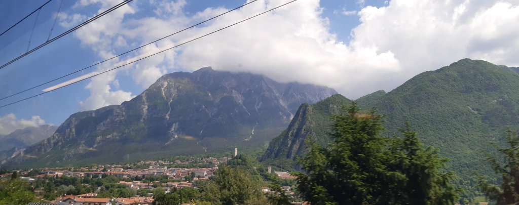 This train obviously isn’t Italian. It is on time, quiet, and perfectly air conditioned (the seven-hour train yesterday was uncomfortably chilly, even though it was 25° outside) and they not only make station announcements in good time, they even have an announcements speaker in the (clean and pleasant) toilet. I tried to take advantage of the peace to have a little snooze before lunch but it wasn’t happening, probably because of two cups of coffee at breakfast. It was just as well because the scenery is intense. As always, it’s hard to capture it from a moving train, but I’ve had a go.