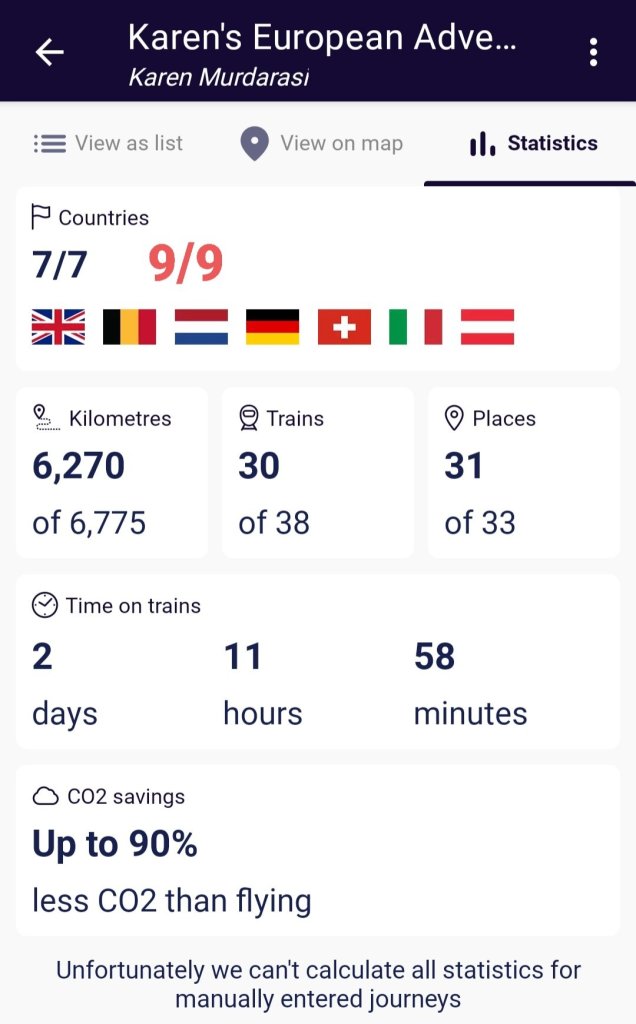 In the graphic above, I’ve updated the number of countries because Interrail doesn’t know about Albania or Greece. The other incomplete numbers are (I think) where I took a journey but it wasn’t on an official travel day (like to Bruges or Ghent) or where I had saved more than one possible train to give myself options.