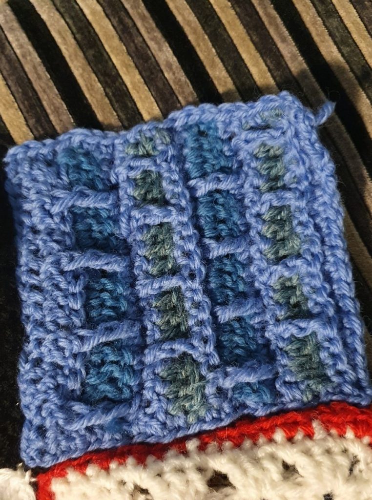 I added a few squares to my patchwork blanket – a Saggitarius A black hole, a Roman shield for the 1900th anniversary of Hadrian’s Wall, a 3D loveheart and a crochet version of Nordic knitting, as well as just a new stitch I wanted to try.