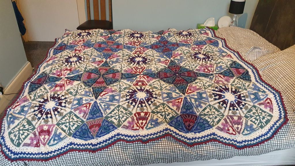 I did finish the enormous kaleidoscope blanket that was nearly finished at the end of last year, adding the edging that made it look very neat.
