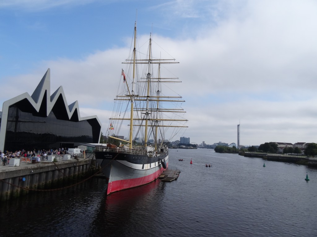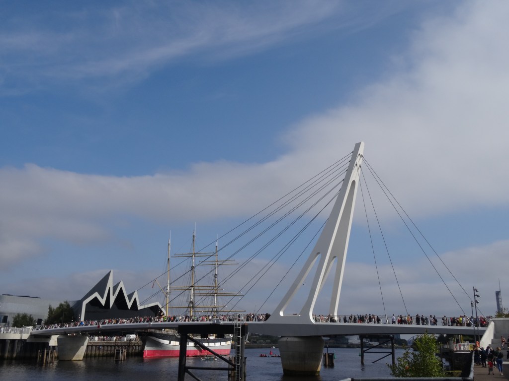 A view from the new bridge of the Riverside Museum and the Tall Ship Glenlee. In the distance are the Armadillo (Clyde Auditorium), and the Glasgow Science Centre and its tower. You can even see a couple of other bridges in the background, the Millennium Bridge and the Squinty Bridge (the Clyde Arc).