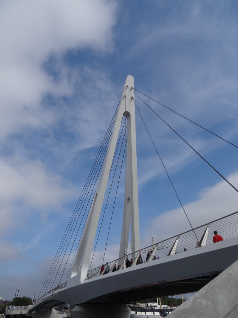The new bridge is a steel cable-stayed opening swing bridge, for those who care about such things. At almost 115m long, it is one of the longest opening footbridges in Europe. It’s also quite nice looking, I think, a bit like its sibling, the Squiggly Bridge.