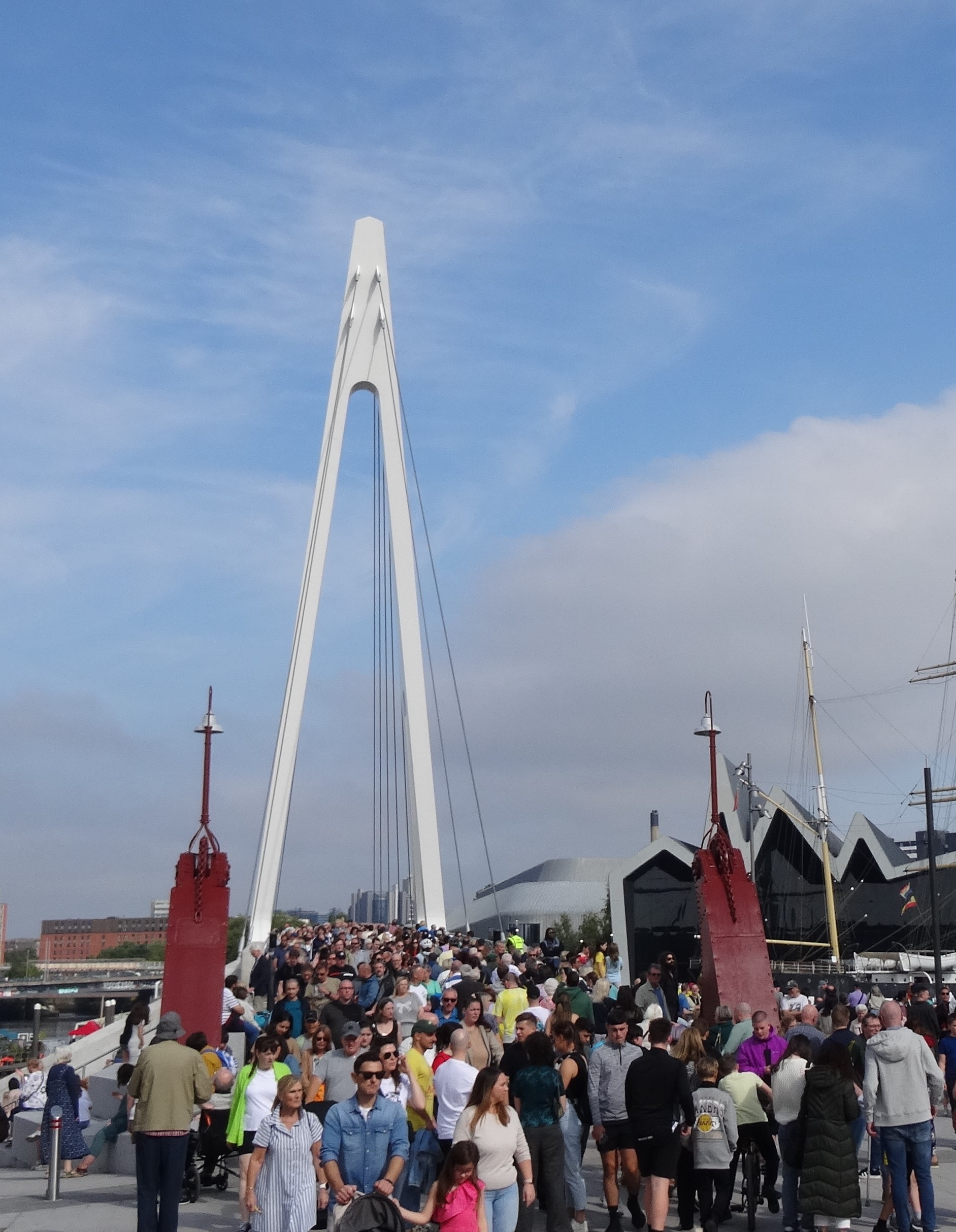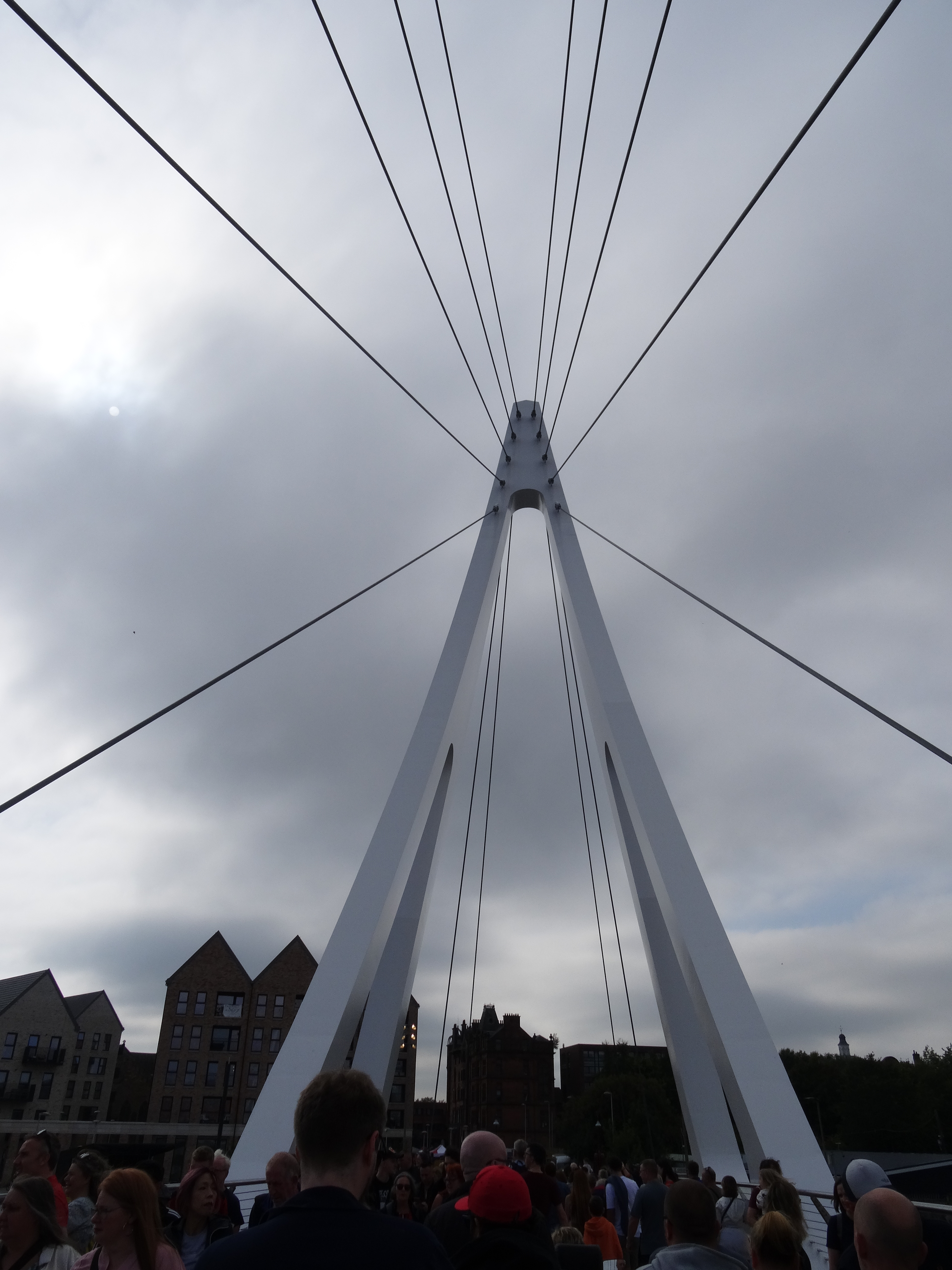 The new bridge is a steel cable-stayed opening swing bridge, for those who care about such things. At almost 115m long, it is one of the longest opening footbridges in Europe. It’s also quite nice looking, I think, a bit like its sibling, the Squiggly Bridge.