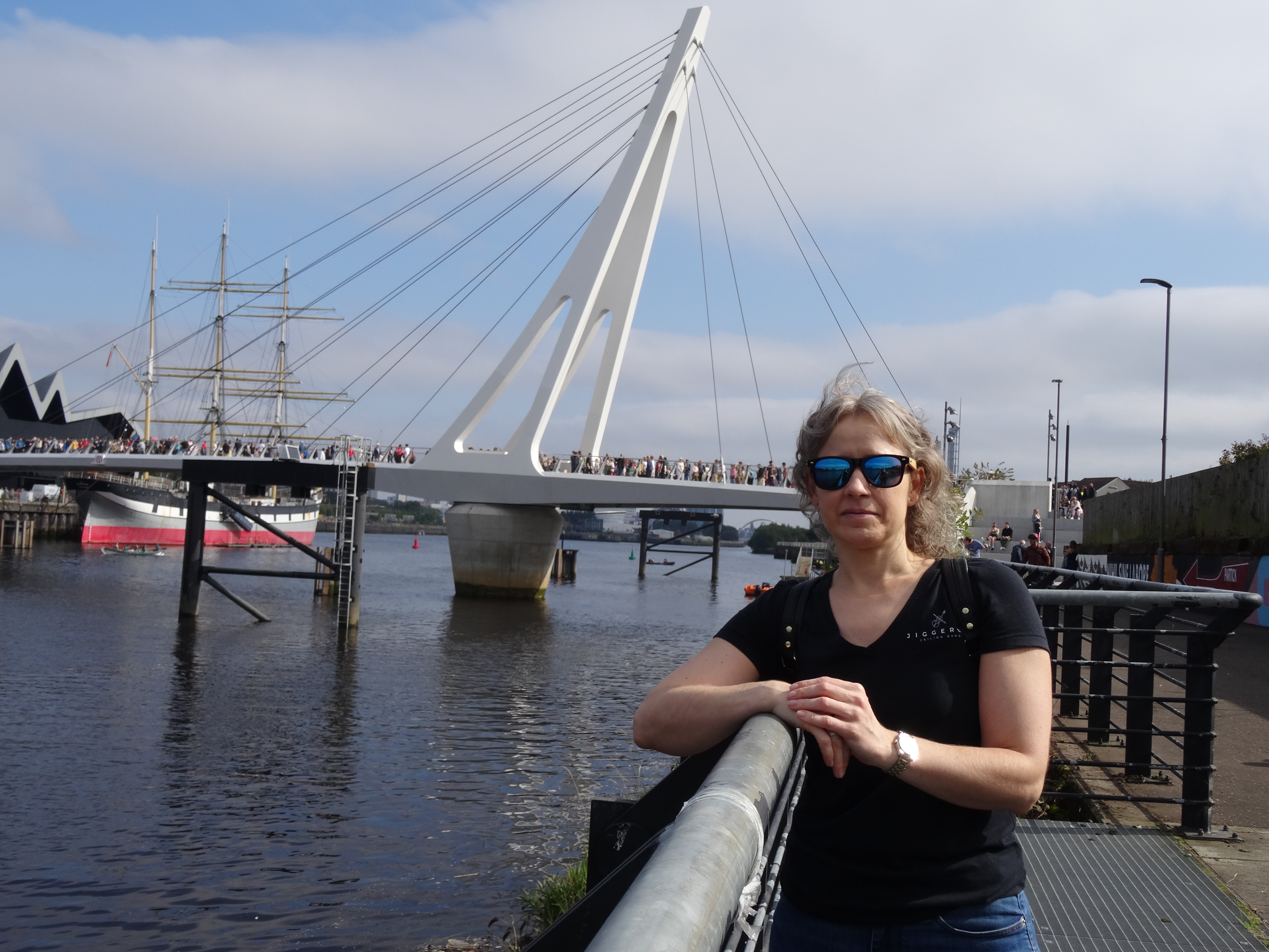 A view from the new bridge of the Riverside Museum and the Tall Ship Glenlee. In the distance are the Armadillo (Clyde Auditorium), and the Glasgow Science Centre and its tower. You can even see a couple of other bridges in the background, the Millennium Bridge and the Squinty Bridge (the Clyde Arc).