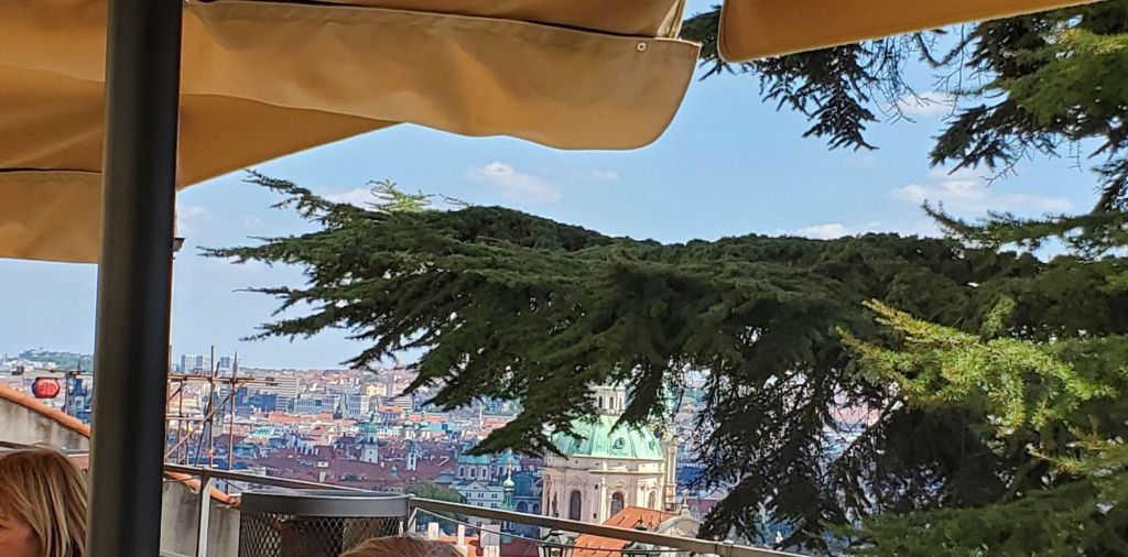 After the fairly long walking tour, I headed up to the hill where the castle is for some lunch. Today I have a 24-hour ticket so I can be more mobile. I got a tram up the big hill but still had a fair walk. I passed Kuchyň, the expensive restaurant that the tour guides had recommended, but the entrance (a narrow doorway in a stone wall) didn’t look all that welcoming, so I thought I’d go down the other side of the hill to “Vegan’s Prague” restaurant. I found it, but it was on the third floor up a very steep, narrow flight of stairs, and when I got there, the balcony was full (only four tables anyway) and the staff were unfriendly. So I descended the stairs and climbed back up to the expensive restaurant, where there were loads of outside tables and the staff were lovely. I had a very unvegan but delicious smoked bunny rabbit salad. In my defence, it’s hard to get anything in Mitteleurope that isn’t heavy, so salad was a good choice. I also kept up my New Year’s resolution with a glass of fizz.