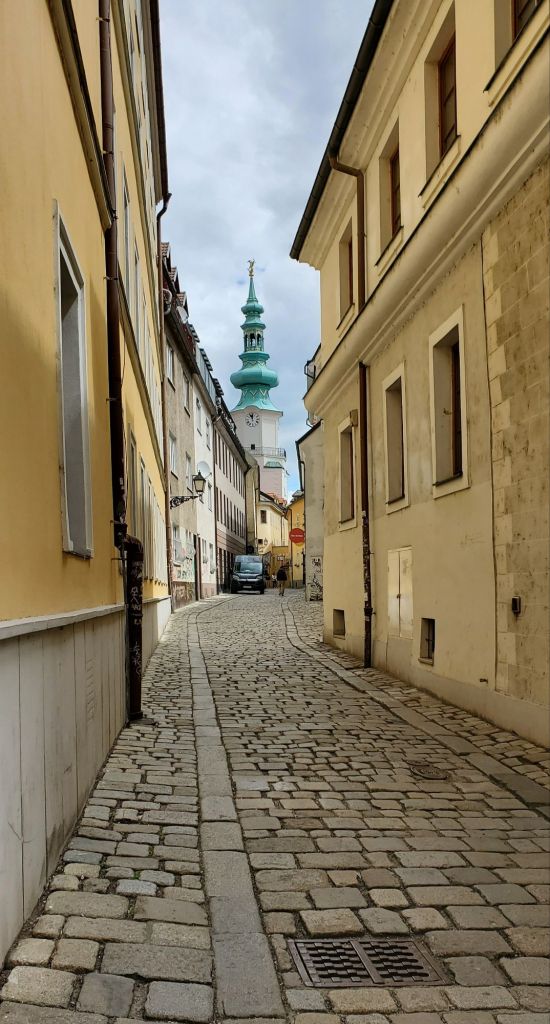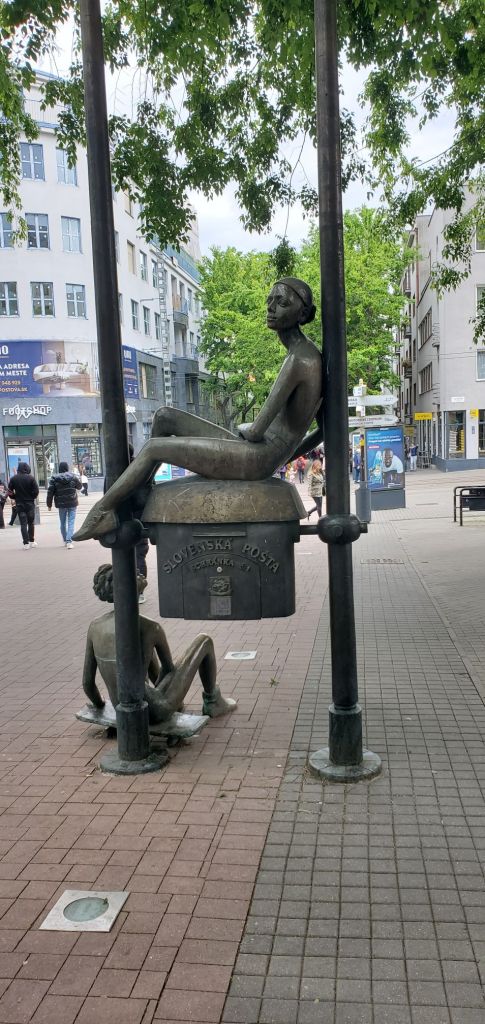 After sampling the limited delights of the old town (see above) I looked for somewhere to eat. There was a place that had good reviews and one of the reviews said that the prices were reasonable, so I went in there and was shown to a table and given a menu. I looked at the menu and got up and walked out. They wanted €15 for a starter! In Bratislava! Fortunately there was a tram really near the restaurant that would take me back to the train station. I got off a couple of stops early to try and find a place I’d seen on the way called the Dungeon Pub, but it didn’t open until four. So I tried a little plain-looking, cash-only restaurant across the road. There were locals there and there was a limited menu, which was given verbally. The food was good – the chicken was melt-in-your-mouth. The wine was fine, if less dry than I like it. And the whole thing, including coffee, came to less than a starter at the other place