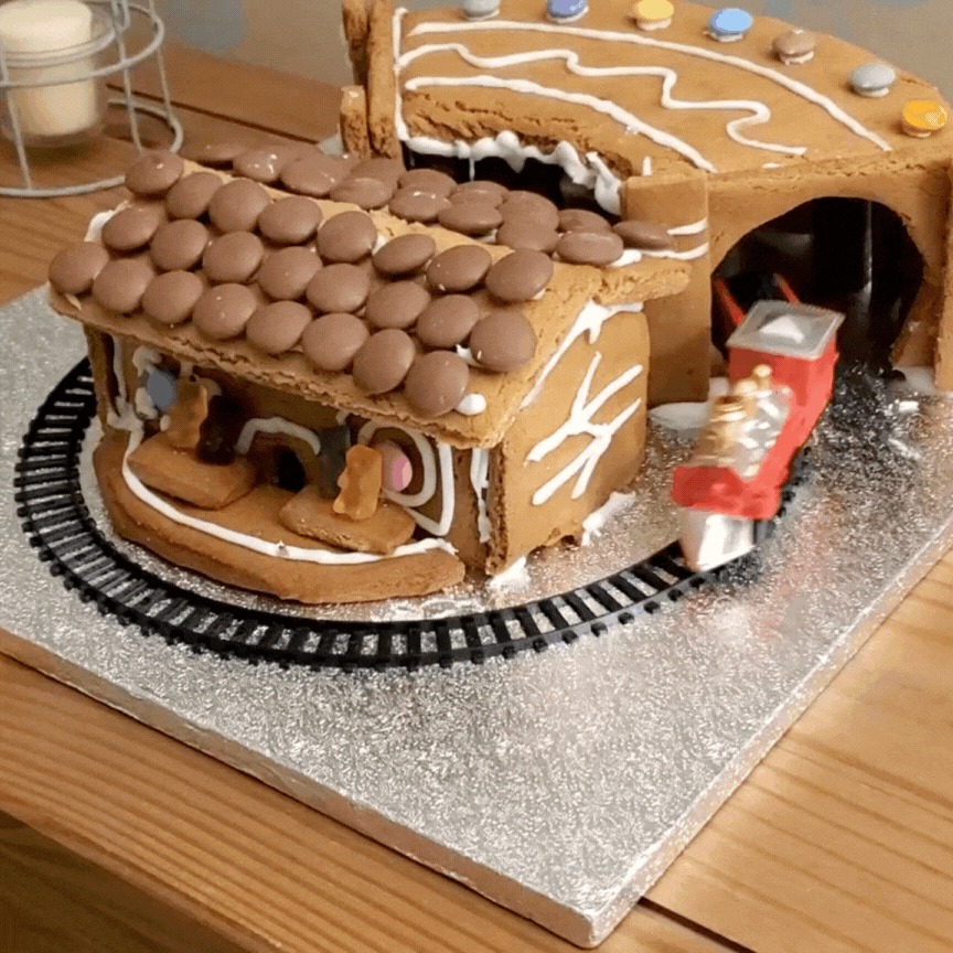 And let’s finish crafts with this year’s gingerbread structure: a station and tunnel complete with gummy bear passengers and a moving train! Great fun to make, play with and eat.