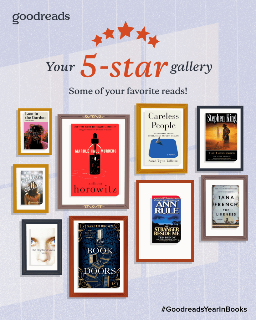 I rather liked this Goodreads graphic of this year’s books. It was probably a better-than-average year of reading, even though (or because) I didn’t have a reading list or guiding principle. If you look into my reading history you’ll see that there are a few books themed around my big Mitteleuropean adventure in spring (Dracula, The Trial, The Third Man, Magic Prague); I went on a wee serial killers jag in the middle of the year (nothing sinister, just one book led to another); there are a few books de la mode (Orbital, Misinterpretation, Sunrise on the Reaping); and many serendipitous finds. I picked up Lost in the Garden while waiting in a coffee shop queue, and it was one of my favourite reads of the year! And The Book of Doors was filed face-on on the wrong shelf of a bookshop in a town where I don’t live but had some time to kill. It was meant for me.