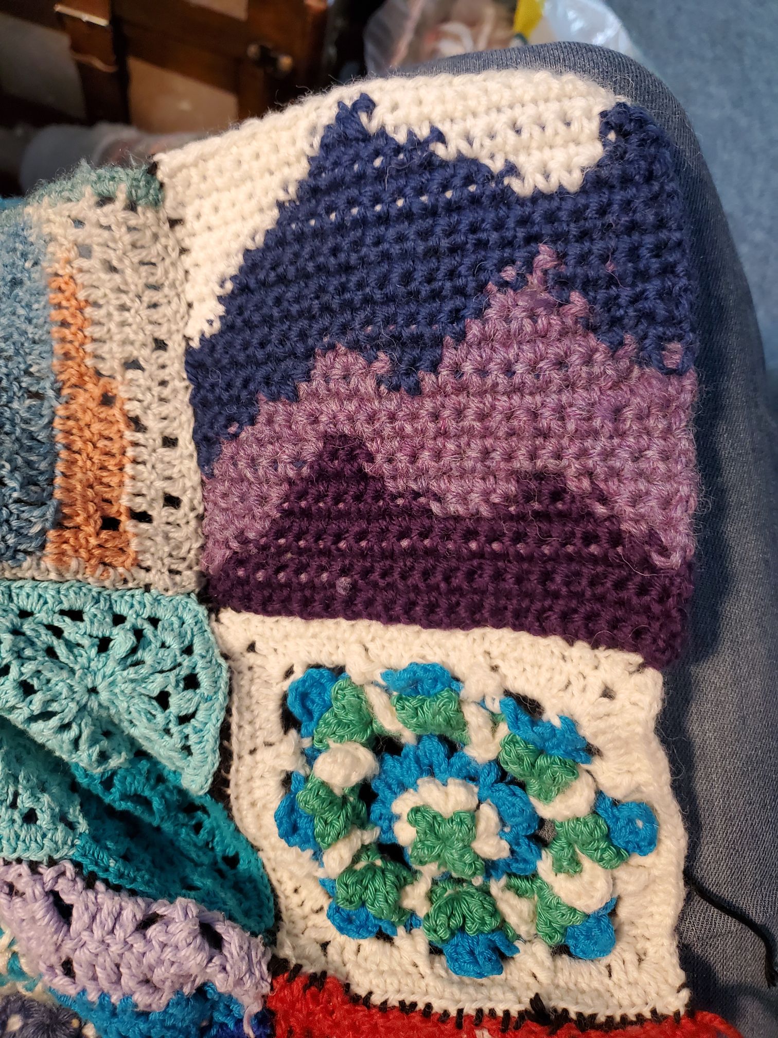 As well as all the sewing (which was mostly from October onward), I did do some crochet and cardmaking, as usual. I didn’t get any figures added to my crochet nativity, but I made myself a nice sleeveless pullover and a few pieces for my patchwork blanket, including a miniature of a baby blanket I made at the start of the year for a baby called Thomas.