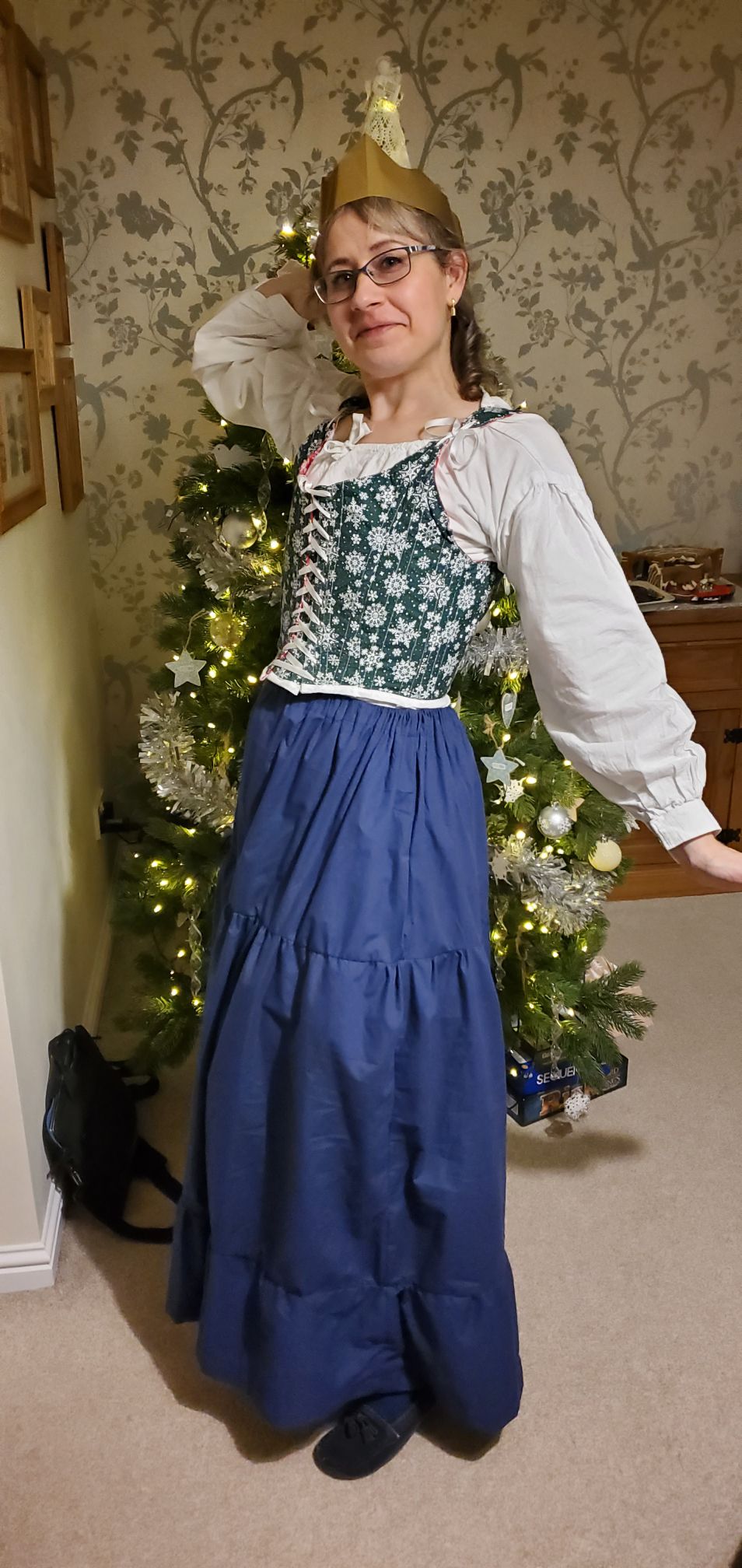 As well as the Christmas bodice I made myself a shift to wear under it (I’ve been watching a lot of historical clothing videos on YouTube), a tiered skirt and a wee blouse. (Very wee; I underestimated the length.)